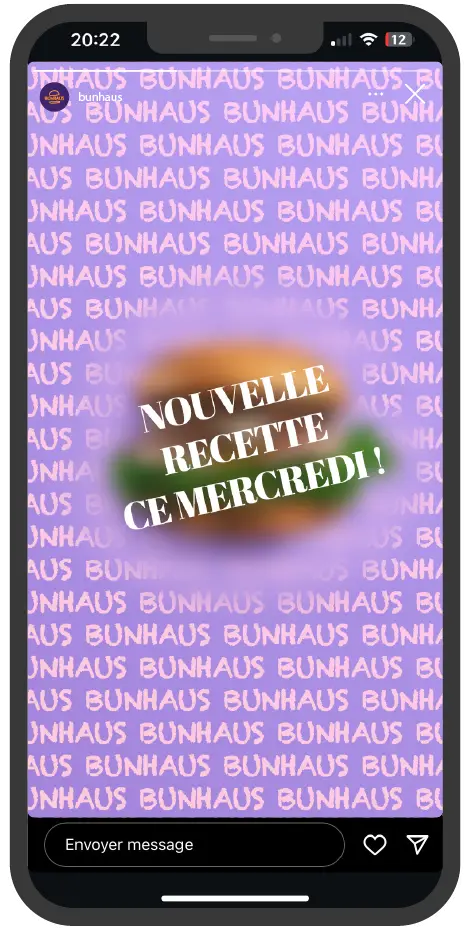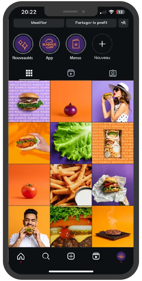 Exemple de feed instagram pour BUNHAUS (fast-food fictif) :